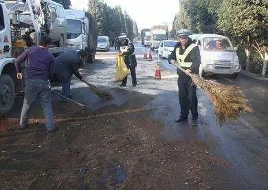 重油污路面,嚴(yán)重影響了市容市貌,交警叔叔也來(lái)幫忙清除了……