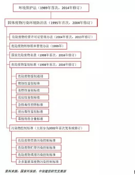 自2012年《“十二五”危險廢物污染防治規(guī)劃》發(fā)布后,國家將危廢污染防治工作作為環(huán)境保護的重點領(lǐng)域。有關(guān)危險廢物管理的法律法規(guī)和技術(shù)規(guī)范也在近幾年間陸續(xù)發(fā)布,加速推進了危廢產(chǎn)業(yè)的發(fā)展。以2004年修訂的《固體廢物污染環(huán)境防治法》為龍頭,以2007年修訂的《危險廢物經(jīng)營許可證管理辦法》和的1999年的《醫(yī)療廢物管理條例》為骨干,以2008年第二次修訂《國家危險廢物名錄》、2016年第三次修訂《國家危險廢物名錄》、2013年的《危險廢物轉(zhuǎn)移聯(lián)單管理辦法》和危險廢物鑒別、焚燒、填埋標準為枝干,我國已構(gòu)建了一系列危廢處理過程管理制度,進一步增加危險廢物處理量、減少非法處置、推動技術(shù)提升及提高危險廢物處理服務(wù)的需求。