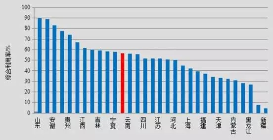 由于國家對危廢的管理實行“就近式、集中式”原則,亦使得危廢處理區(qū)域性特點明顯。2014年,工業(yè)危險廢物綜合利用量較大的省份為山東639.8萬噸,占全國工業(yè)企業(yè)危險廢物綜合利用量的31.0%;湖南232.5萬噸,占全國工業(yè)企業(yè)的11.3%;青海146.0萬噸,占全國工業(yè)企業(yè)的7.1%;云南137.1萬噸,占全國工業(yè)企業(yè)的6.6%;江蘇125.3萬噸,占全國工業(yè)企業(yè)的6.1%;全國工業(yè)危險廢物綜合利用率為56.4%。共有11個省份工業(yè)危險廢物綜合利用率超過全國平均水平,其中山東、湖南和安徽超過80%。下圖是2014年我國各地區(qū)工業(yè)危險廢物綜合利用率: