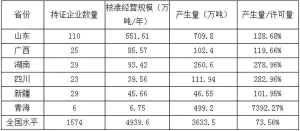 據(jù)各省市環(huán)保廳最新數(shù)據(jù)統(tǒng)計顯示,全國持有危廢處理許可證企業(yè)數(shù)近1600家,核準經(jīng)營規(guī)模約4900萬噸/年。根據(jù)環(huán)保部數(shù)據(jù)統(tǒng)計,2014年度全國危廢產(chǎn)生量為3633.5萬噸。全國平均供給水平在70%多,即產(chǎn)生量除以核準經(jīng)營規(guī)模在70%多的水平,但區(qū)域之間存在較大差異,低于50%的省份有 8個,多為經(jīng)濟相對發(fā)達區(qū)域,危廢產(chǎn)生量超過核準經(jīng)營規(guī)模的省份有6個。下圖是危廢產(chǎn)生量超出核準經(jīng)營規(guī)模的省份: