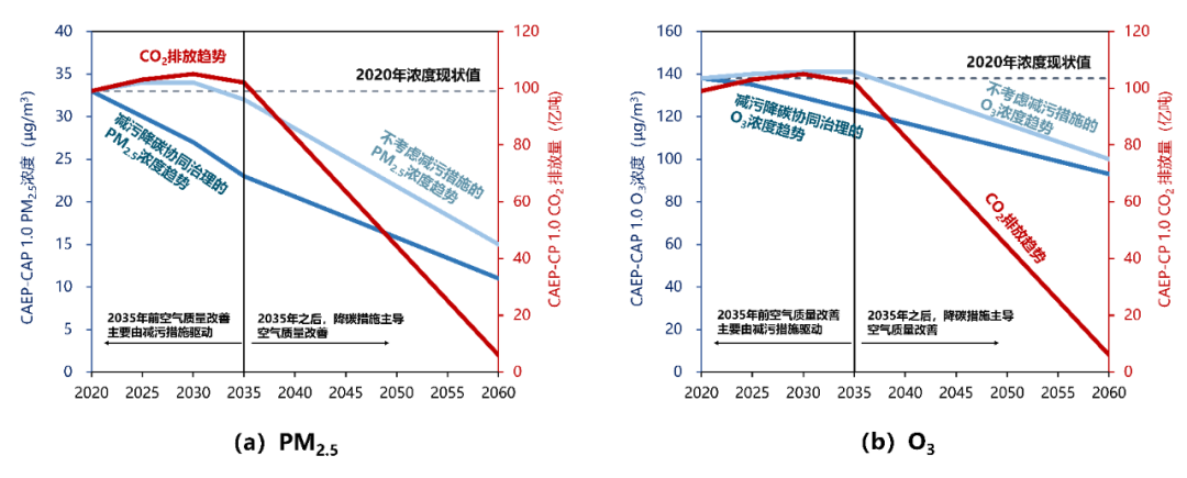 2.1 大氣環(huán)境治理與碳減排的協(xié)同路徑與思路我國大氣污染與 CO2 排放同根同源,具備協(xié)同治理的巨大潛力。從中長期來看,應(yīng)科學(xué)研判不同歷史時(shí)期減污與降碳的主要驅(qū)動(dòng)力,系統(tǒng)謀劃協(xié)同減排路徑。從區(qū)域?qū)用鎭砜矗瑧?yīng)著重關(guān)注大氣污染嚴(yán)重的地區(qū),這些地區(qū)通常也是碳排放量大的區(qū)域。從行業(yè)和部門層面來看,重化工業(yè)、交通運(yùn)輸、民用等均是大氣污染物和 CO2 排放的主要來源,應(yīng)作為協(xié)同治理的重點(diǎn)予以關(guān)注。此外,推動(dòng)城市空氣質(zhì)量達(dá)標(biāo)和碳排放達(dá)峰“雙達(dá)”試點(diǎn)示范,探索典型城市實(shí)現(xiàn)“雙達(dá)”的主要路徑、關(guān)鍵措施、政策機(jī)制,也是有益嘗試。已有研究表明 [12, 13, 16],碳達(dá)峰碳中和目標(biāo)愿景對驅(qū)動(dòng)空氣質(zhì)量改善有巨大貢獻(xiàn)。如圖 3 所示,在碳達(dá)峰碳中和目標(biāo)的驅(qū)動(dòng)下,全國 PM2.5年均濃度和 O3 濃度年評價(jià)值(日最大 8 小時(shí)濃度均值的第 90 百分位數(shù))有望在 2060 年左右達(dá)到世界衛(wèi)生組織 2005 版空氣質(zhì)量準(zhǔn)則值(PM2.5年均濃度小于 10 μg/m3,O3日最大 8 小時(shí)濃度均值小于 100 μg/m3),屆時(shí)降碳對減污(PM2.5)的累計(jì)貢獻(xiàn)將超過 80%[12]。在 2030 年實(shí)現(xiàn)碳達(dá)峰目標(biāo)之前,需要堅(jiān)持以美麗中國目標(biāo)和碳達(dá)峰目標(biāo)為雙牽引,持續(xù)強(qiáng)化大氣污染治理措施,特別是揮發(fā)性有機(jī)物(VOCs)排放相關(guān)的源頭替代等措施,實(shí)現(xiàn) PM2.5和 O3污染協(xié)同控制以及與碳減排的協(xié)同;這一階段,減污目標(biāo)將推動(dòng)中國獲得額外的降碳收益 [16]。2035 年以后,隨著大氣污染物末端治理技術(shù)進(jìn)一步減排的潛力逐步收窄,根本性的結(jié)構(gòu)調(diào)整等降碳措施將成為 CO2 與大氣污染物協(xié)同減排的核心牽引,降碳措施將主導(dǎo)減污的進(jìn)程[12,17]。