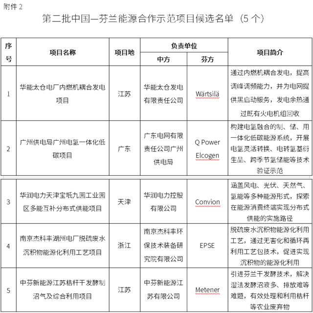 2. 第二批中國—芬蘭能源合作示范項目候選名單(5個)