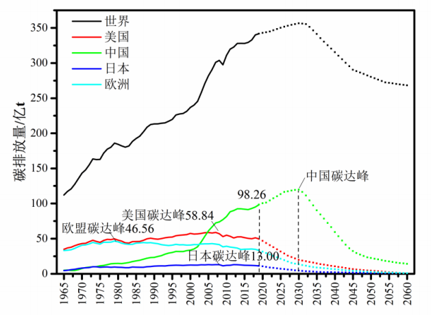 根據BP數據,2019年我國二氧化碳排放量為98.26億噸,占世界的28.8%。從我國與歐盟、美國等歷史碳排放量和預期增長趨勢看(圖1),歐盟、美國、日本在1979年、2007年、2008年已實現(xiàn)碳達峰。我國十八大報告指出,要大力推進生態(tài)文明建設,堅持節(jié)約資源和保護環(huán)境的基本國策,堅持節(jié)約優(yōu)先、保護優(yōu)先、自然恢復為主的方針,著力推進綠色發(fā)展、循環(huán)發(fā)展、低碳發(fā)展,形成節(jié)約資源和保護環(huán)境的空間格局、產業(yè)結構、生產方式,從源頭上扭轉生態(tài)環(huán)境惡化趨勢,為人民創(chuàng)造良好生產生活環(huán)境,為全球生態(tài)安全作出貢獻。
