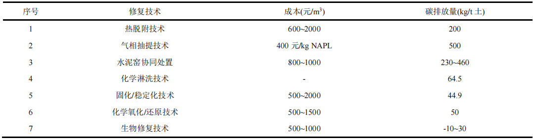 建設用地土壤污染主體為焦化、石化、醫(yī)藥、金屬冶煉等企業(yè),污染物主要為多環(huán)芳烴、鹵代烴、石油烴、鎘、砷等重金屬。建設用地土壤修復中常用的技術有熱脫附技術、氣相抽提技術、固化/穩(wěn)定化技術、化學淋洗技術、化學氧化/還原技術、水泥窯協(xié)同處置技術等物理化學方法。通過對環(huán)境修復工程企業(yè)調研,針對有機物污染土壤的修復常用技術為熱脫附、化學氧化/還原、水泥窯協(xié)同處置、化學淋洗等,對重金屬污染土壤的修復技術主要有固化/穩(wěn)定化、植物修復等。根據各修復工程的修復費用或能源消耗,可以計算出所產生的二氧化碳排放量。