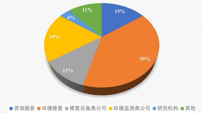 土壤修復產業(yè)的組成主要包括了環(huán)境咨詢服務類公司、環(huán)境修復類公司、修復設備類公司、修復藥劑類公司、環(huán)境監(jiān)測類公司以及環(huán)境修復研究院等主要6類企事業(yè)單位。其中環(huán)境修復企業(yè)在資金、企業(yè)規(guī)模、企業(yè)數量方面成為土壤修復產業(yè)引領者(圖4)。環(huán)境咨詢服務、環(huán)境修復藥劑生產、環(huán)境監(jiān)測以及環(huán)境修復技術研究主要為咨詢服務類和環(huán)境檢測類企業(yè),能源消耗較少,相對產生的二氧化碳量少。同時土壤調查項目、土壤環(huán)境狀況評估、環(huán)境采樣檢測項目相比土壤修復項目數量大致相同。環(huán)境修復、環(huán)境修復設備制造主要為高能耗、高投入類產業(yè),能源消耗高、產生的二氧化碳多。其中又以土壤修復項目遠多于土壤修復設備制造企業(yè),從而土壤修復產業(yè)中碳排放以土壤修復工程為主。目前土壤修復項目以建設用地修復為主,近兩年,無論是項目金額或項目數量,建設用地修復都遙遙領先。農用地修復項目較少,但其正醞釀等待爆發(fā)。根據北極星環(huán)境修復網資料,建設用地修復成本為20~50萬/畝,其中包含土壤調查、工程實施、風險評估等諸多環(huán)節(jié)。這些環(huán)節(jié)產生的二氧化碳數基本為凈碳排放量,只有少數土地修復后被建設為公園、濕地等綠化用地。