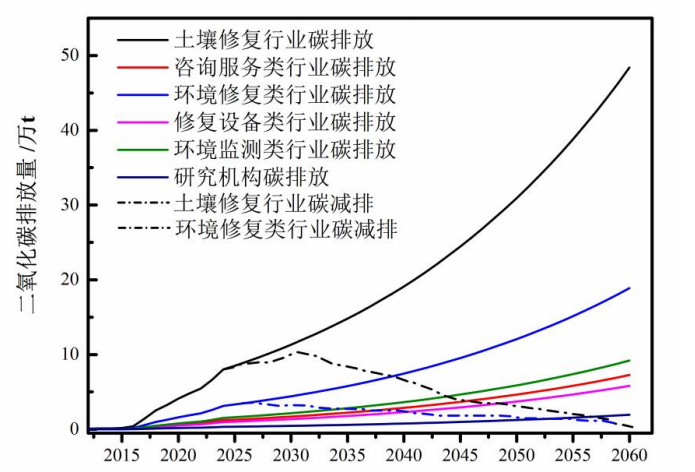 作為土壤修復產業(yè)鏈中核心環(huán)節(jié),土壤修復工程應放在土壤修復產業(yè)碳排放控制的首位,應對修復工程中修復技術擇優(yōu)選擇,選擇低碳排放或負碳排放修復技術。調整后,土壤修復工程的碳排放量會減少90%以上,其變化趨勢由實線曲線增加轉變?yōu)橄仍黾雍鬁p少至穩(wěn)定趨勢(圖5,虛線曲線)。其次,對于土壤修復產業(yè)鏈中上游環(huán)節(jié),應對于碳排放量第二的環(huán)境監(jiān)測類企業(yè)與第三的環(huán)境咨詢類企業(yè)進行碳減排控制,應用5G新技術、視頻會議、數據共享等可以降低碳排放。對于環(huán)境修復工程、環(huán)境監(jiān)測項目、咨詢服務項目這三項的碳排放控制,使土壤修復產業(yè)中“雙碳”目標的實現(xiàn)可以快速實現(xiàn)。最后,對土壤修復產業(yè)鏈中下游行業(yè),對于修復設備制造公司、修復藥劑制備公司以及研究中心等的碳排放進行監(jiān)測,技術升級等,減少二氧化碳的釋放。通過對土壤修復產業(yè)鏈的三個環(huán)節(jié)的綜合控制,針對環(huán)境修復類企業(yè)的技術導向,同時加強對環(huán)境檢測與咨詢服務類行業(yè)數據共享等使碳排放量可以在2030年前后達到峰值,2060年前達到碳中和。