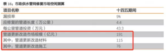 有機(jī)構(gòu)預(yù)測(cè)稱,“十四五”期間供水管網(wǎng)更新改造帶來(lái)的市場(chǎng)空間有望達(dá)191億元。