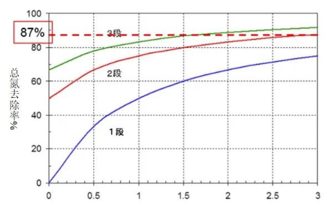 ▲不同段數(shù)A/O工藝的總氮去除率對(duì)比