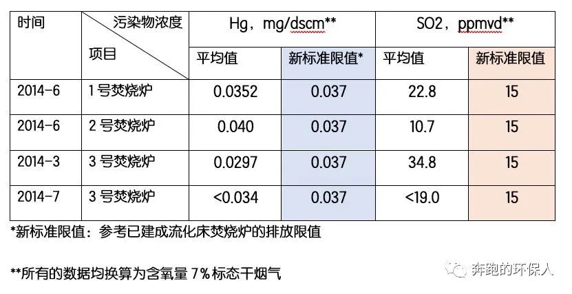 2014年的煙氣排放檢測數(shù)據(jù)顯示,煙氣中的污染物主要是汞和SO2無法滿足2016年生效的新標(biāo)準(zhǔn)排放限值,以下每個(gè)數(shù)據(jù)都是三次測試的平均值: