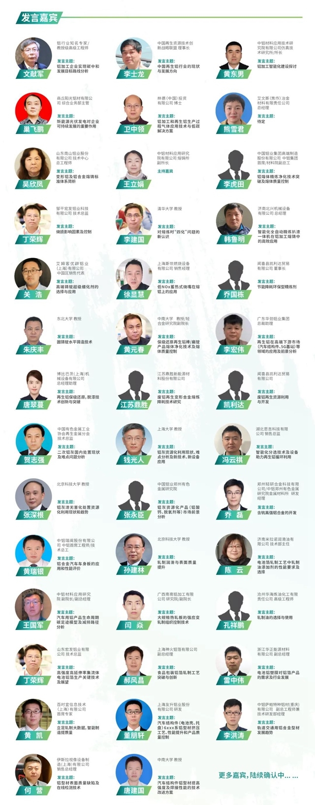 部分已報(bào)名企業(yè) 安徽玉成光華鋁業(yè)有限公司、池州市九華明坤鋁業(yè)有限公司、大力神鋁業(yè)股份有限公司、東北輕合金有限責(zé)任公司、福建省南平鋁業(yè)股份有限公司、富源錦鴻金屬制品有限公司、(今飛控股集團(tuán)有限公司)、廣東華昌鋁廠有限公司、廣東華勁鋁業(yè)集團(tuán)、廣西柳州銀海鋁業(yè)股份有限公司、廣西南南鋁加工有限公司、貴州貴鋁新材料股份有限公司、河北立中有色金屬集團(tuán)有限公司、河南平煤隆基光伏材料有限公司、河南省淅川鋁業(yè)(集團(tuán))有限公司、河南萬(wàn)達(dá)鋁業(yè)有限公司、河南鑫泰鋁業(yè)有限公司、河南中孚高精鋁材有限公司、河南中孚實(shí)業(yè)高精鋁公司、河南中孚實(shí)業(yè)股份有限公司、湖北新金洋資源股份公司、湖南中創(chuàng)空天新材料股份有限公司;
