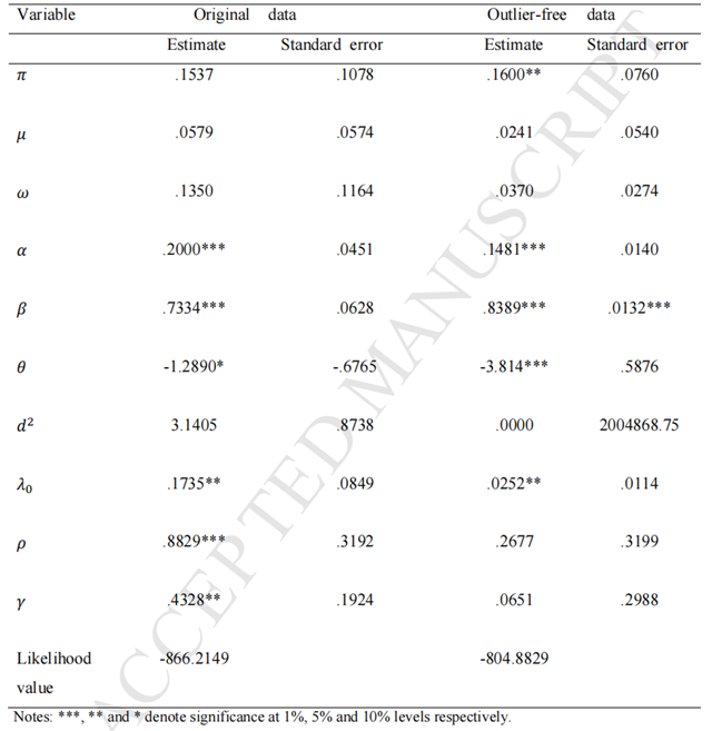 運用AR(1)-GARCH(1,1)模型對EUA回報的時間序列進行擬合,用擬極大似然估計法估計系數(shù),將超出正常波動范圍的回報率視為離群數(shù)據(jù),公式如圖1。AR(1)-GARCH(1,1)模型的優(yōu)點是即使對誤差項的分布形式選擇有誤,或者模型選擇有誤,仍能準確找出離群值。