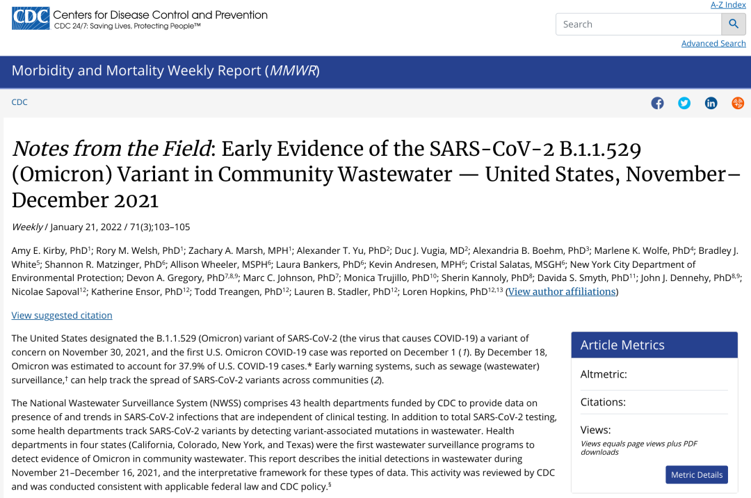 如今,新的一輪疫情卷土重來,污水處理行業(yè)再次面臨巨大的考驗。建議各地環(huán)保部門在加強監(jiān)管的同時,還要給予一定的幫助扶持,并在醫(yī)療廢水處理環(huán)節(jié)加強預(yù)處理,盡可能保證達標(biāo)排放,從而避免對下游污水處理廠造成沖擊,減少污水處理環(huán)節(jié)的壓力。 進入3月,一場以“奧密克戎”為主的本土疫情在我國多地發(fā)生,范圍涉及吉林、福建、河北、廣東、遼寧、黑龍江、上海、天津、山東、湖南等多個省市。最新數(shù)據(jù)顯示,據(jù)國家衛(wèi)健委3月21日通報,3月20日0—24時,31個?。ㄗ灾螀^(qū)、直轄市)和新疆生產(chǎn)建設(shè)兵團報告新增確診病例2027例,其中境外輸入病例80例,本土病例1947例。這輪疫情最大的特點,就是傳播速度快、隱匿性強。相關(guān)研究顯示,奧密克戎毒株BA.1的傳播速度比德爾塔毒株快了77%,而奧密克戎毒株BA.2的傳播速度又比BA.1更快66%。受其影響,生活污水中新冠病毒的密度也出現(xiàn)大幅增加。污水處理相關(guān)從業(yè)人員應(yīng)該注意做好防護,把奧密克戎病毒的影響降至最低點。2022年,是新冠疫情流行的第三年。春節(jié)過后,國內(nèi)已經(jīng)有多個地方報告感染者病例。在長春,3月11日,長春市疫情指揮部發(fā)布通知,要求停止一切非必要流動,全市小區(qū)、單位封閉式管理,學(xué)校停課,公共交通停運,機關(guān)居家辦公,企事業(yè)單位停止運營。當(dāng)日,吉林省3月累報病例破千,吉林市、長春市兩地為集中點。此后4天,該省3月病例更是突破萬人。在浙江,自從3月3日以來,已經(jīng)發(fā)生了9起疫情,7起為獨立疫情,其中4起為境外輸入,5起與入境物品相關(guān)。在上海,3月20日,上海迪士尼度假區(qū)(包括上海迪士尼樂園、迪士尼小鎮(zhèn)和星愿公園)也宣布從3月21日起暫時關(guān)閉,恢復(fù)運營時間待定。在山東,青島、威海、淄博、德州等四地發(fā)生聚集性疫情,奧密克戎BA.1.1和BA.2同時流行,涉及學(xué)校、工廠等聚集場所。截至3月19日,該省已經(jīng)累計感染超過3000人。全國范圍看,據(jù)國家衛(wèi)生健康委網(wǎng)站3月21日通報,3月20日0—24時,31個省(自治區(qū)、直轄市)和新疆生產(chǎn)建設(shè)兵團報告新增確診病例2027例,其中境外輸入病例80例,本土病例1947例。相比之前,這輪疫情最大的特點,就是傳播速度快、隱匿性強。據(jù)南京市衛(wèi)健委黨委書記、主任夏海鳴介紹,有研究顯示,奧密克戎毒株BA.1的傳播速度比德爾塔毒株快77%,BA.2的傳播速度又比BA.1快66%。“最嚴峻”“最復(fù)雜”——在吉林省、東莞市等地的官方發(fā)布中,都在以這樣的字樣來形容此輪疫情。山東省疾控中心傳染病防制所所長寇增強表示,自2020年以來,當(dāng)?shù)嘏c新冠疫情打交道已經(jīng)超過2年,其間也處理過一定規(guī)模的本土聚集性疫情,但進入3月之后,“疫情形勢完全不一樣”。國家衛(wèi)健委新聞發(fā)言人米鋒也表示,當(dāng)前,全球正在經(jīng)歷新冠疫情第四波流行高峰,連續(xù)十周每周報告新增病例均超過1000萬例,亞洲地區(qū)呈現(xiàn)快速上升態(tài)勢,我國周邊有關(guān)國家和地區(qū)不斷刷新單日新增病例最高紀錄,疫情傳入風(fēng)險不斷加大。習(xí)近平總書記在3月17日召開的中共中央政治局常務(wù)委員會會議上強調(diào),堅持就是勝利。各地區(qū)各部門各方面要深刻認識當(dāng)前國內(nèi)外疫情防控的復(fù)雜性、艱巨性、反復(fù)性,進一步動員起來,統(tǒng)一思想,堅定信心,堅持不懈,抓細抓實各項防疫工作。隨著新一輪疫情的反復(fù),污水處理場所檢出的新冠病毒密度也開始大幅增加。據(jù)央視財經(jīng)3月17日報道,美國疾控中心在過去兩周內(nèi)對各地污水處理站進行檢測后公布的數(shù)據(jù)顯示,超過三分之一的污水處理點檢測出新冠病毒密度增加,其中有37%的漲幅在100%以上,有30%的漲幅超過1000%。在3月1日至3月10日期間,美國疾病控制與預(yù)防中心 (CDC)監(jiān)測的超過三分之一的廢水樣本點都顯示出新冠病毒呈上升趨勢。事實上,污水站的新冠病毒密度,已經(jīng)成為了新冠病毒傳播的一個早期預(yù)警信號。今年1月21日,美國疾病控制與預(yù)防中心 (CDC)曾經(jīng)發(fā)布過一份報告,其中指出,新冠病毒的變種奧密克戎(Omicron)很有可能在美國首例確診病例官宣的一周多前,就已經(jīng)存在于紐約市的廢水中了。據(jù)介紹,美國是在去年12月1日報告了美國首個奧密克戎病例。但CDC的樣品分析顯示,紐約市早在2021年11月21日就已經(jīng)有人感染了奧密克戎,這個時間比美國首例早了10天。▼美國CDC關(guān)于污水中發(fā)現(xiàn)新冠病毒變種的報告截圖 | 圖源:CDCCDC國家廢水監(jiān)測系統(tǒng)(NWSS)的項目負責(zé)人Amy Kirby對此表示:“廢水監(jiān)測真是一個非常強大的工具,它不僅是能為病毒傳播提供預(yù)警信號,還有助于跟蹤每波疫情的完整發(fā)展趨勢和軌跡。”正是由于生活污水中的新冠病毒含量與單日新增確診病例數(shù)呈現(xiàn)出“正相關(guān)”的關(guān)系,因此,近期美國多地污水站新冠病毒密度大幅上漲后,就有媒體和專家指出,這意味著美國新的疫情高峰可能即將到來。疫情卷土重來,污水處理廠站的一線工作人員感染風(fēng)險也大幅上升,如何做好防護?相關(guān)研究顯示,2針mRNA疫苗