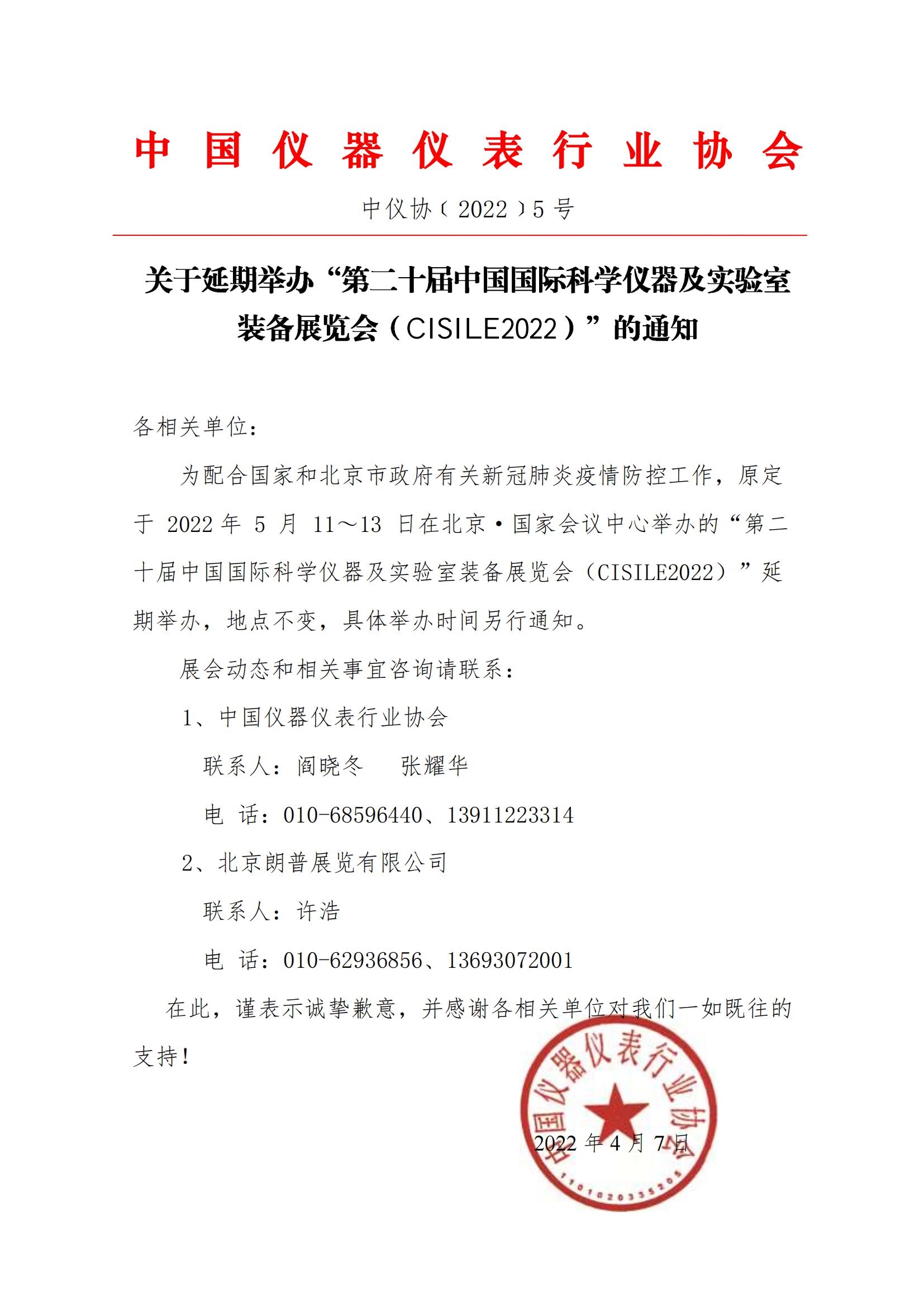 關(guān)于延期舉辦“第二十屆中國國際科學(xué)儀器及實驗室裝備展覽會(CISILE2022)”的通知