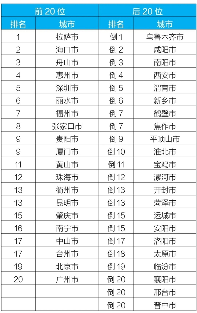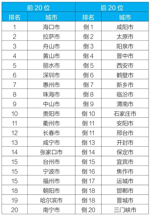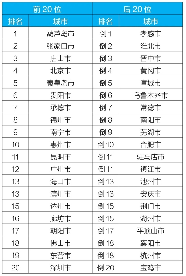 質(zhì)量排名前20位和后20位城市名單