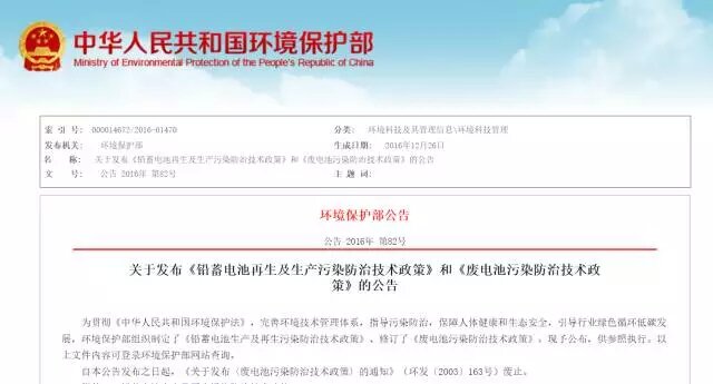 為貫徹《中華人民共和國(guó)環(huán)境保護(hù)法》,完善環(huán)境技術(shù)管理體系,指導(dǎo)污染防治,保障人體健康和生態(tài)安全,引導(dǎo)行業(yè)綠色循環(huán)低碳發(fā)展,環(huán)境保護(hù)部組織制定了《鉛蓄電池生產(chǎn)及再生污染防治技術(shù)政策》、修訂了《廢電池污染防治技術(shù)政策》?,F(xiàn)予公布,供參照?qǐng)?zhí)行。以上文件內(nèi)容可登錄環(huán)境保護(hù)部網(wǎng)站查詢(xún)。