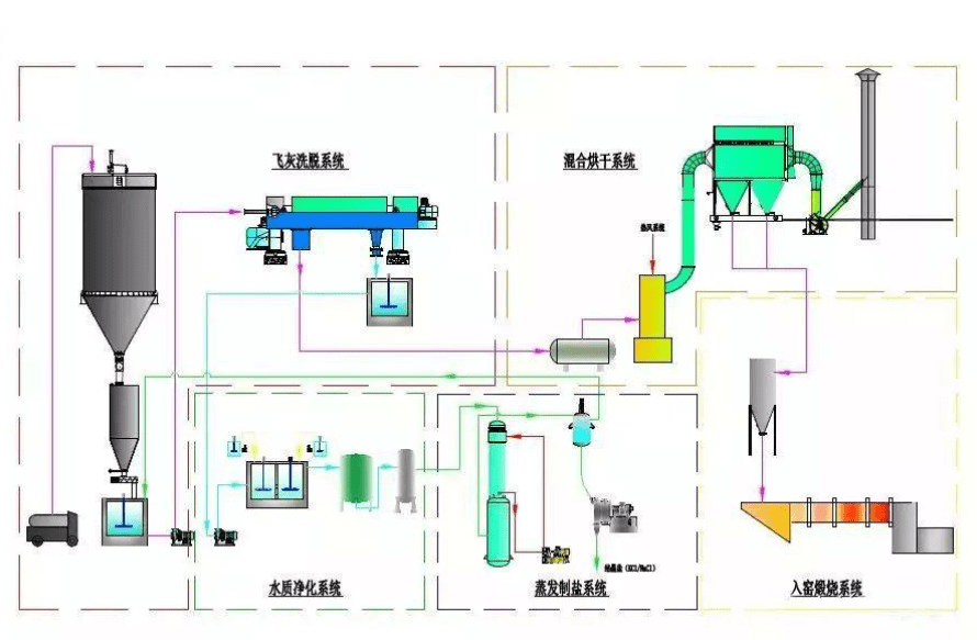 飛灰水洗工藝起源于水泥窯協(xié)同處置危險廢物?!端喔G協(xié)同處置固體廢物污染控制標準》(GB 30485-2013)發(fā)布后,利用水泥窯進行飛灰處置成為了許多填埋用地不足的外地城市,如北京、杭州、蕪湖等,普遍采用的新方式。由于水泥窯對入窯物料有嚴格的氯含量控制要求,針對具有高含氯特性的焚燒飛灰,也逐漸形成了“多級逆流漂洗+蒸發(fā)制鹽”的預(yù)處理工藝。生活垃圾焚燒飛灰水洗提鹽工藝由飛灰洗脫系統(tǒng)、水質(zhì)凈化系統(tǒng)、蒸發(fā)制鹽系統(tǒng)和烘干系統(tǒng)等4大系統(tǒng)組成。目前的工藝已經(jīng)能實現(xiàn)自動連續(xù)下料,水洗效果穩(wěn)定,用水量小,重金屬和二噁英轉(zhuǎn)移率低,運行穩(wěn)定,自動化程度高等。經(jīng)預(yù)處理后的飛灰含氯量可穩(wěn)定達到≤1%。