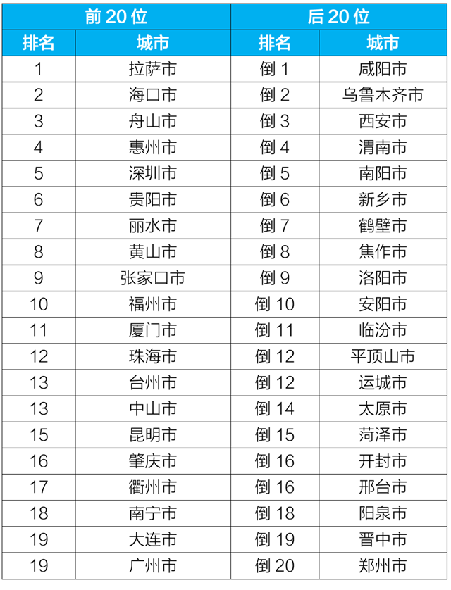 4月,168個重點(diǎn)城市中,??凇⒗_和舟山市等20個城市空氣質(zhì)量相對較好(從第1名至第20名);鶴壁、保定和新鄉(xiāng)市等20個城市空氣質(zhì)量相對較差(從倒數(shù)第1名至并列倒數(shù)第19名),見附表1。