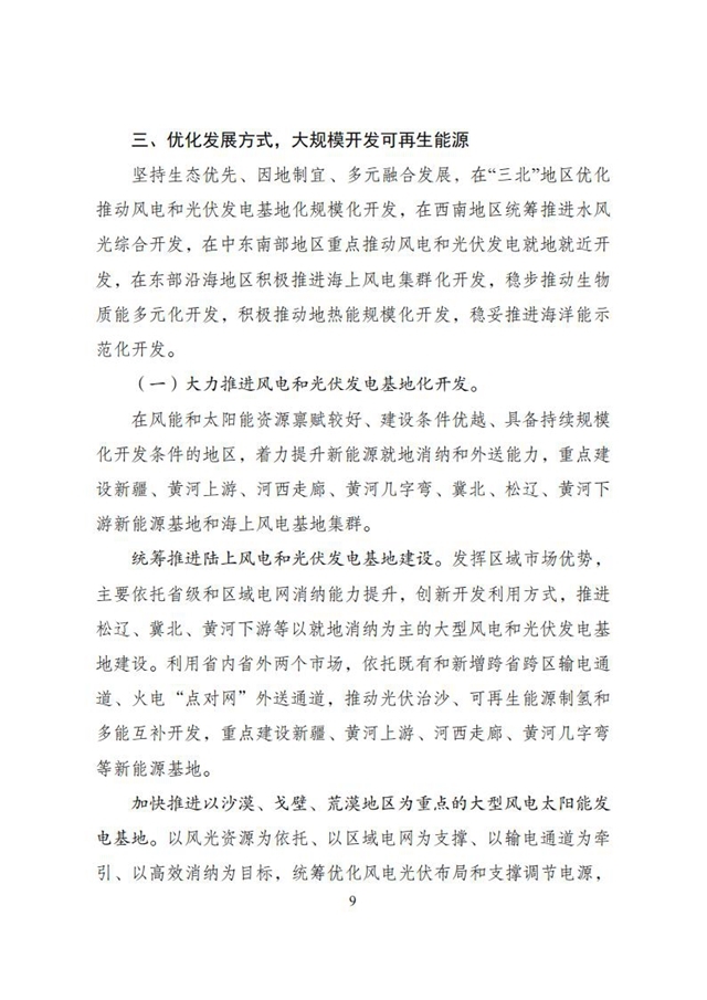 在“三北”地區(qū)優(yōu)化推動(dòng)風(fēng)電和光伏發(fā)電基地化規(guī)模化開(kāi)發(fā),在西南地區(qū)統(tǒng)籌推進(jìn)水風(fēng)光綜合開(kāi)發(fā),在中東南部地區(qū)重點(diǎn)推動(dòng)風(fēng)電和光伏發(fā)電就地就近開(kāi)發(fā),在東部沿海地區(qū)積極推進(jìn)海上風(fēng)電集群化開(kāi)發(fā)。