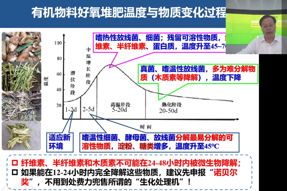 (在一次在線講座中,吳老師提出,如果12-24小時降解纖維素、半纖維素,木質素,建議先申報諾貝爾獎,不必費力兜售“生化處理機”,圖為講座截圖)