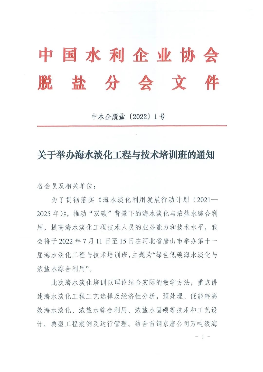 為了貫徹落實(shí)《海水淡化利用發(fā)展行動(dòng)計(jì)劃(2021—2025年)》,推動(dòng)“雙碳”背景下的海水淡化與濃鹽水綜合利用,由中國(guó)水利企業(yè)協(xié)會(huì)脫鹽分會(huì)主辦的第十一屆海水淡化工程與技術(shù)培訓(xùn)班計(jì)劃于2022年7月11日至15日在河北省唐山市曹妃甸區(qū)舉辦,本屆海水淡化培訓(xùn)班的主題是“綠色低碳”海水淡化與濃鹽水綜合利用,課程內(nèi)容豐富充實(shí),教學(xué)質(zhì)量專(zhuān)業(yè)。此次培訓(xùn)以理論結(jié)合實(shí)踐的教學(xué)方法,結(jié)合首鋼京唐公司“燃-熱-電-水-鹽”五效一體高效循環(huán)利用技術(shù)現(xiàn)場(chǎng)進(jìn)行實(shí)踐教學(xué)。
