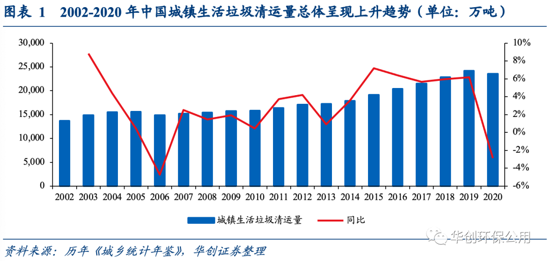 2020年中國城鎮(zhèn)生活垃圾清運量15年來首次下降。自2020年新冠疫情爆發(fā)以來,國內正常的社會生產生活秩序受到一定程度影響,民眾消費不振也使生活垃圾清運量出現一定程度的下滑。依據2021年10月發(fā)的《2020城鄉(xiāng)建設統計年鑒》,2020年我國城鎮(zhèn)生活垃圾清運量為2.35億噸較2019年下降2.87%,這也是自2006年以來中國城鎮(zhèn)生活垃圾清運量首次呈現下降趨勢。