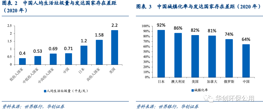 伴隨經濟發(fā)展以及居民生活水平的提升,城鎮(zhèn)人均產生垃圾量也將隨之提升。我們選取第六次(2010)和第七次人口普查(2020)的城鎮(zhèn)人口數據,計算得出2010年我國城鎮(zhèn)人均垃圾清運量為0.65千克/天,2020年這一數字已升至0.71千克/天,同期我國的城鎮(zhèn)化率由49.7%提升至63.9%,然而這兩項數據與發(fā)達國家均存在一定差距。根據世界銀行報告《2050年全球固體廢物管理一覽》的統計,高收入國家的人均生活垃圾量均值為1.58千克/天,美國更是達到了2.2千克/天,是我國的三倍;我國約64%的城鎮(zhèn)化率與發(fā)達國家普遍80%以上的城鎮(zhèn)化率相比差距明顯,與部分發(fā)展中國家70%以上的城鎮(zhèn)化率相比,也尚存一定提升空間。