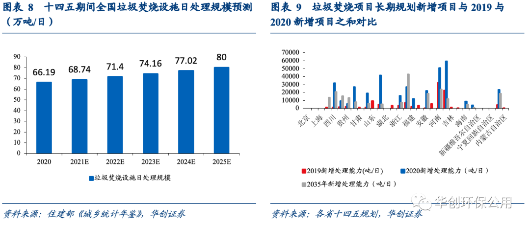 十四五政策明確2025年焚燒產能需達80萬噸/日(十三五為58萬噸),2020至2025年行業(yè)將保持4%的復合增速。我們對根據各省生活垃圾焚燒發(fā)電中長期專項規(guī)劃做了對比與分析后發(fā)現,近期(2020年)規(guī)劃計劃新增項目加2019年各省新增項目合計502個,焚燒能力合計46.81萬噸/日,而遠期(2021-2030年)規(guī)劃垃圾焚燒項目合計僅276個,焚燒能力合計25.94萬噸/日。由此我們可以得出,無論是項目數量還是處理規(guī)模,未來10年的增量還沒有2019年和2020年兩年相加之和多,尤其是處理規(guī)模僅僅是近期的55%左右。半數以上的省份2019年與2020年新增項目之和大于長期規(guī)劃新增項目的總數。