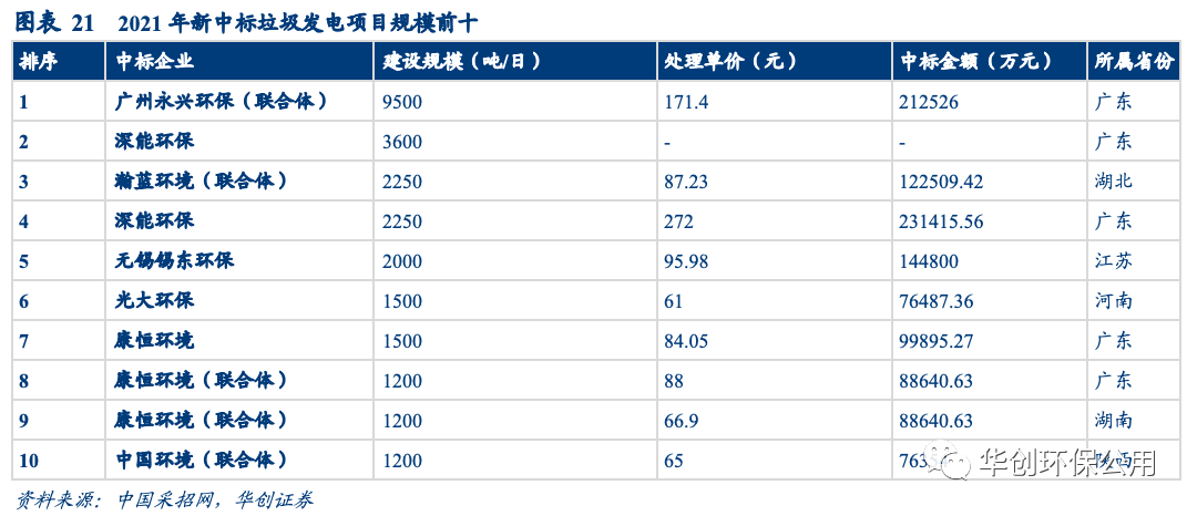 產能視角:行業(yè)步入成熟期,馬太效應明顯。據不完全統計,2022年1-4月垃圾焚燒新中標項目數量較去年同期有所提升,但訂單的釋放省份多數位于中部地區(qū),日處理量超過1000噸僅3個,故新增產能和投資額同比分別下滑;后補貼時代,新中標的垃圾焚燒發(fā)電項目噸垃圾處置費上浮明顯,較2021年平均79.72元/噸增長20.21%。高質量項目中標企業(yè)以頭部公司為主,鮮有小公司的身影出現,行業(yè)馬太效應繼續(xù)增強。