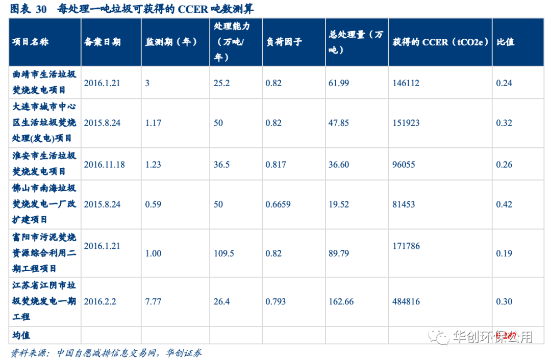我們采用垃圾處理量與所獲得CCER噸數之比作為統計口徑,從簽發(fā)和備案項目中選取了較為典型的垃圾焚燒項目計算平均值,根據測算垃圾焚燒企業(yè)每處理一噸垃圾,平均獲得0.287噸CCER,在假設CCER價格為20元/噸的情況下,噸垃圾增收約為6元。