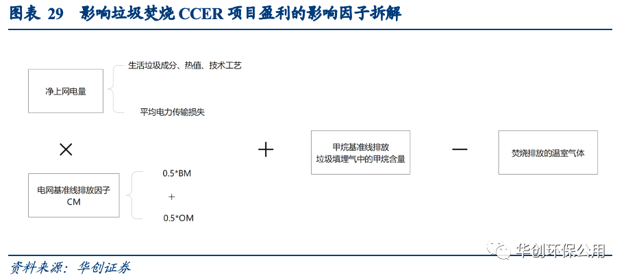 CM-072-V01“多選垃圾處理方式”(第一版)中詳細規(guī)定了測算一個垃圾焚燒項目所產生的CCER噸數的方法學。與可再生能源發(fā)電項目相比,垃圾焚燒發(fā)電項目不僅替代了項目所在地電網的火力發(fā)電的碳排放,還避免了垃圾填埋產生的甲烷排放;但焚燒化石燃料也會帶來一定的溫室氣體排放。