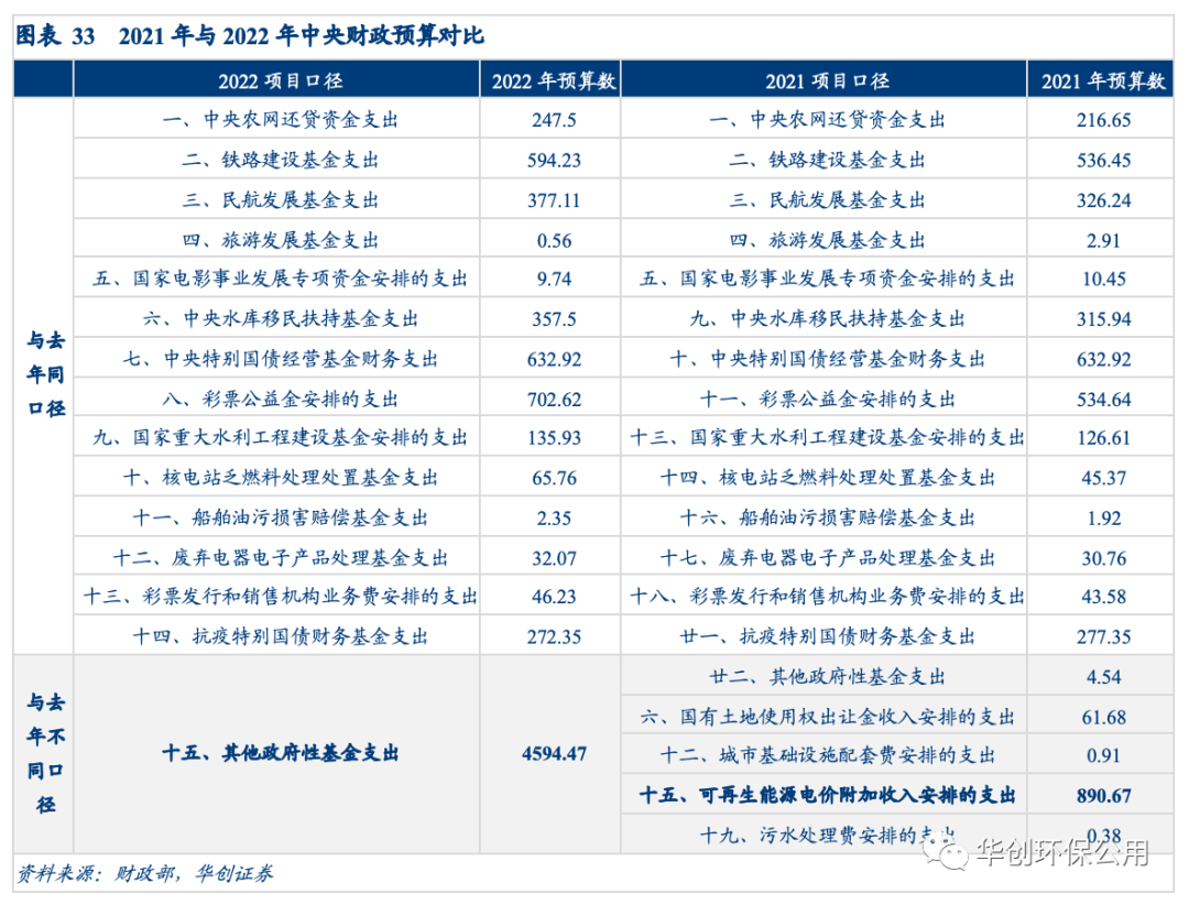 22年政府預算支出中有4500億元的補貼增量或將用于可再生能源補貼的一次性發(fā)放。2022年與2021年中央財政預算支出的口徑發(fā)生了變化,其中21年出現的“可再生能源電價附加收入安排的支出”科目在22年的財政支出預算中消失,22年的統計口徑中其他政府性基金支出項目由21年的4.54億元驟增至4594.47億元??紤]到22年將21年的若干個口徑進行合并,假設除可再生能源補貼項目的其他合并項目預算支出保持不變,預計今年將能騰挪出4500億元的財政支出供可再生能源補貼的發(fā)放,此前的拖欠問題有望得到一次性解決。