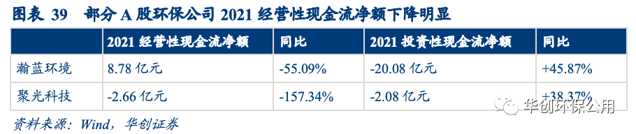 2021年8月,財政部發(fā)布了11個政府和社會資本合作(PPP) 會計處理實施問答,對PPP項目建造期間發(fā)生的建造支出在現金流量表中應如何列示做出進一步說明:PPP項目建造期間相關建造支出作為投資性現金流列示調整至經營性現金流列示。我們認為該會計準則的變更是2021年部分環(huán)保上市公司經營性現金流下滑的原因之一。