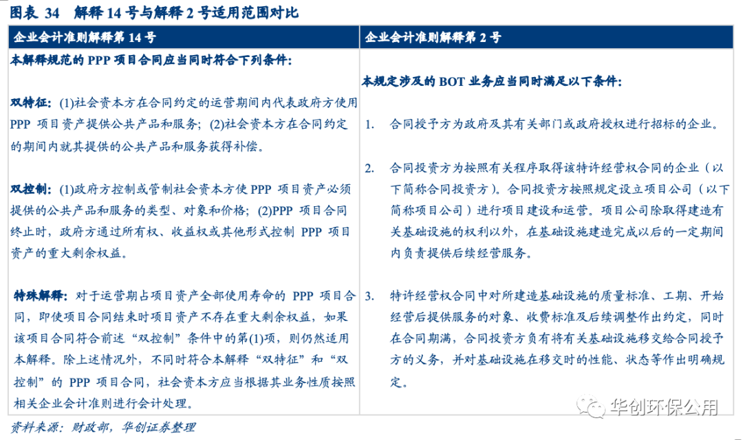 解釋14號對適用范圍做出了更詳細的說明,應當符合“雙控制”與“雙特征”。解釋2號僅對“合同授予方”、“合同投資方”、“特許經營權”等關鍵名詞做出解釋而解釋14號則對適用范圍做出明確說明——滿足“雙控制”與“雙特征”條件,并對運營期占項目資產全部使用壽命項目、不符合“雙控制”與“雙特征”條件項目的處理方法做出解釋。