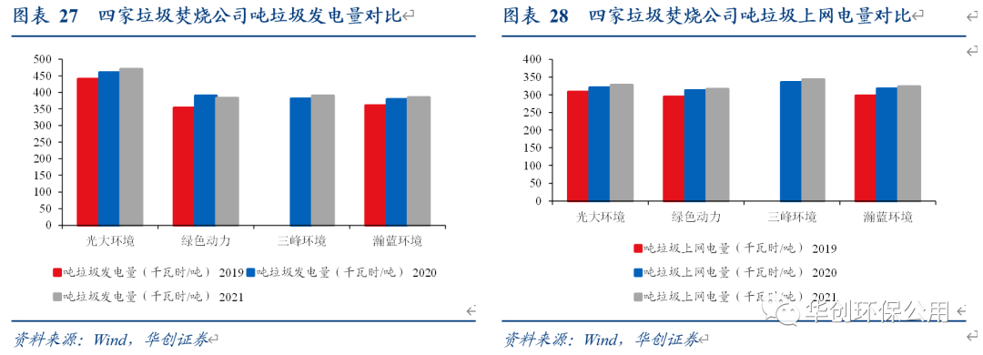 我們選取光大環(huán)境、三峰環(huán)境、瀚藍環(huán)境和綠色動力四家上市公司進行比較,所有公司的2019-2021年的噸垃圾發(fā)電量與噸垃圾上網電量均呈現上升趨勢。2021年光大環(huán)境的噸垃圾發(fā)電量已達到470度,大幅領先其余公司;噸上網電量四家公司差距不大,均在320-340度這一區(qū)間。我們認為噸垃圾發(fā)電量的逐年提升亦可以增厚垃圾焚燒項目的盈利能力,削弱國補退坡的不利影響。