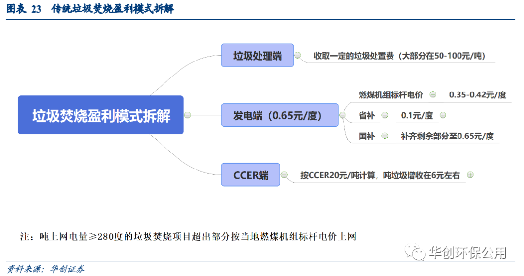 按照傳統盈利模式拆解,噸垃圾上網電量和垃圾處理費是影響垃圾焚燒發(fā)電運營收入的主要因素。理想情況下,垃圾焚燒發(fā)電的商業(yè)模式優(yōu)質清晰,處理費主要和項目所在地政府的財政支付能力有關,而噸垃圾上網電量則與公司的技術手段和垃圾熱值有關。但近兩年行業(yè)內即出現了如國補退坡這樣的擾動因素,也出現了CCER 等利潤增厚因素,此部分我們將詳細剖析各類新變化對盈利因子的擾動情況。