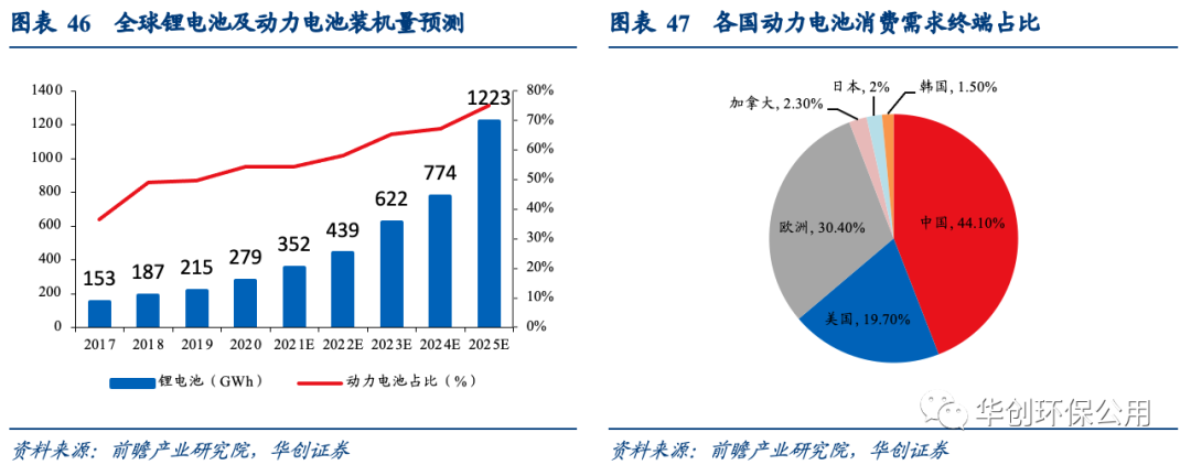 在電動汽車市場快速增長帶動下,動力型鋰離子電池繼續(xù)保持快速增長勢頭。全球動力電池年新增裝機量保持快速增長,根據前瞻產業(yè)研究院的預測,2025年全球鋰電池裝機量將會達到1223GWh,動力電池占比高達75.2%。2020年中國動力電池終端消費需求高達44.1%,居世界第一位。硫酸鈷和硫酸鎳是生產三元動力電池的重要材料,未來有望量價齊升。