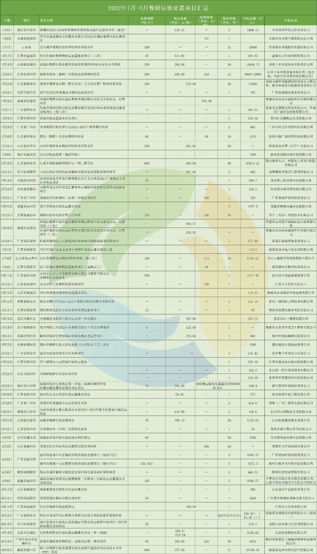 此外,在統(tǒng)計數(shù)據(jù)中,我們還可以發(fā)現(xiàn)本地國企中標趨勢明顯增強。例如,宜昌建投水務(wù)有限公司中標了1.6億的宜昌市廚余垃圾資源化處理特許經(jīng)營權(quán)項目,眉山市城投中恒能環(huán)??萍加邢薰緞t中標了1.1億眉山市餐廚垃圾綜合利用項目。近年來,不少企業(yè)憑借自身優(yōu)勢與政府簽訂了餐廚垃圾/廚余垃圾項目單一來源采購協(xié)議。其中,北京固廢物流有限公司就以單一來源的方式拿下了2256萬的北京市東城區(qū)五所餐廚廚余垃圾收集運輸服務(wù)項目。這類項目最大特點就是只有一家供應(yīng)商,不存在競爭。不過,在2021年發(fā)布的97個餐廚/廚余垃圾項目中,有18個項目為單一來源方式,占比18.56%,其中多以收運處理一體化項目為主。今年單一來源方式采購項目明顯減少。而隨著垃圾焚燒項目“降溫”,龍頭企業(yè)布局餐廚垃圾市場的步伐也逐漸加快。2022年1-5月,光大環(huán)境共中標3個餐廚垃圾處理項目,拿標數(shù)量位居中標企業(yè)第一位,項目總預(yù)算金額超6億元(2021年同期,光大環(huán)境拿下3個項目,拿標數(shù)量位居中標企業(yè)第一位)。從不久前發(fā)布的2021年光大環(huán)境年報中可以看出,餐廚垃圾處理項目為光大環(huán)境凈利潤增長助力不少。而作為環(huán)衛(wèi)市場老牌企業(yè)的盈峰環(huán)境,2019開始切入餐廚市場。去年,盈峰環(huán)境全資子公司廣東盈峰環(huán)境投資有限公司中標淮安餐廚擴建項目,該擴建項目建成后,合同總額預(yù)計73612萬元(含收轉(zhuǎn)運合同總額33236萬元)。今年,盈峰環(huán)境又拿下了2個餐廚項目,分別位于湖南、安徽、廣東三省,服務(wù)范圍已從前端環(huán)衛(wèi)項目運營到末端的餐廚垃圾處置,成為跨界經(jīng)營的典范。還有長期從事垃圾滲濾液相關(guān)裝備制造和運營業(yè)務(wù)的萬德斯,2021年計劃以2.36億的價格收購時代桃源,切入有機垃圾領(lǐng)域(后停止收購)。今年取得了江蘇省連云港市東??h餐廚廢棄物處理PPP項目,處置規(guī)模為100噸/日。值得注意的是,北清環(huán)能在最近一年內(nèi)累計花費8億元大規(guī)模收購餐廚項目,業(yè)務(wù)呈快速發(fā)展態(tài)勢。總體來看,我國餐廚垃圾處理行業(yè)雖然發(fā)展10年有余,但始終發(fā)展緩慢,項目和企業(yè)規(guī)模都比較小,競爭格局較為分散,目前尚沒有巨頭出現(xiàn)。不過,隨著市場逐漸釋放,單體項目的規(guī)模越來越大,未來,餐廚垃圾處理市場的巨頭或許也即將出現(xiàn),此次寶安項目可能就是轉(zhuǎn)折點。有人毛利27%,有人虧損