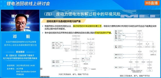 污染擔(dān)責(zé),生產(chǎn)者責(zé)任延伸,全過程監(jiān)管等新變化,鄧毅主任都一一進(jìn)行了解讀,隨后就廢動(dòng)力鋰電池回收利用的背景、行業(yè)現(xiàn)狀、資源價(jià)值、拆解過程的環(huán)境風(fēng)險(xiǎn),《廢鋰離子動(dòng)力蓄電池處理污染控制技術(shù)規(guī)范》(HJ1186-2021)等內(nèi)容進(jìn)行了梳理,同時(shí)提出了幾點(diǎn)建議。