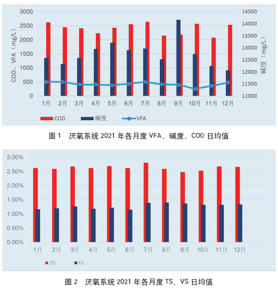 廣州福山生物質(zhì)綜合處理廠厭氧系統(tǒng)2021年運(yùn)行狀況見(jiàn)圖1、圖2。