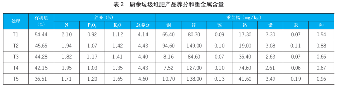 表2為各處理廚余垃圾堆肥產(chǎn)品的有機(jī)質(zhì)、養(yǎng)分和重金屬含量。在堆肥過程中,各處理有機(jī)質(zhì)含量不斷下降,但均滿足《有機(jī)肥料》(NY/T 525-2021)標(biāo)準(zhǔn)(有機(jī)質(zhì)含量≥30%)。由于有機(jī)物礦化會導(dǎo)致堆體體重減輕發(fā)生濃縮效應(yīng),總養(yǎng)分(以N+P2O5+K2O計)含量增加,各處理含量均>4.0%,具有較高的營養(yǎng)價值。對于各處理重金屬含量,鋅的含量最高(80.30~149.00mg/kg),其次為銅和鉻(7.52~94.60mg/kg和17.30~74.60mg/kg),再者是鉛(2.61~3.49mg/kg),鎘、汞、砷的含量保持在較低范圍(0.070~0.125mg/kg、0.061~0.187mg/kg和0.538~0.964mg/kg),遠(yuǎn)低于《有機(jī)肥料》(NY/T 525-2021)中重金屬濃度標(biāo)準(zhǔn)。
