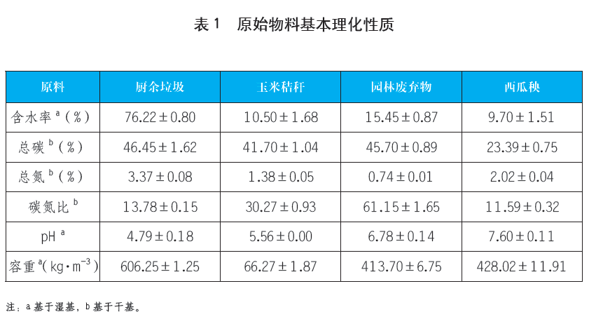 本試驗(yàn)以分類后廚余垃圾為原料,以粒徑控制在40~50mm以下的玉米秸稈(CS)、園林剪枝(GP)和西瓜秧(WS)按一定比例混合后,作為輔料加入到廚余垃圾中進(jìn)行堆肥。其中廚余垃圾主要含有60.79%菜葉、8.96%剩飯、19.31%果皮、3.68%蛋殼、1.97%骨頭以及5.29%其他物質(zhì)(以濕重計),主要分布在<30mm粒徑段,其次為>80mm和50~60mm的較大粒徑段,其他粒徑段含量較少。堆肥原料的理化性質(zhì)如表1所示。