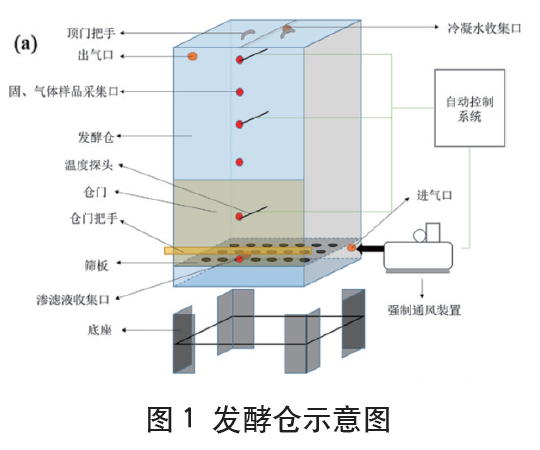 本研究采用模擬隧道發(fā)酵倉堆肥高度的中試密閉堆肥倉(1m×1m×3.5m)中進(jìn)行廚余垃圾堆肥試驗(yàn)。堆肥倉配備了上、中、下三個溫度探頭,自動控制系統(tǒng)連接溫度傳感器和通風(fēng)裝置,以實(shí)現(xiàn)溫度記錄和通風(fēng)控制,堆肥倉示意圖如圖1所示。本試驗(yàn)根據(jù)所添加的三輔料(其中CS:GP:WS=1:1:1)比例不同,共設(shè)置5個處理過程,分別添加5%(T1)、10%(T2)、12.5%(T3)、15%(T4)和20%(T5)三輔料。此外,為緩解餐廚垃圾酸化導(dǎo)致升溫緩慢的問題,堆肥中添加了1%(以干重計)的生石灰。整個堆肥周期設(shè)為20天,其中第1~10天為高溫發(fā)酵階段,通風(fēng)速率為0.05~0.15m3/m3·min;第10~20天為后熟化階段,通風(fēng)速率為0.02m3/m3·min。在堆肥開始后第0、2、6、10、20天,在發(fā)酵倉的上、中、下三點(diǎn)每次分別采集約300g固體樣品用于后續(xù)指標(biāo)的測定。