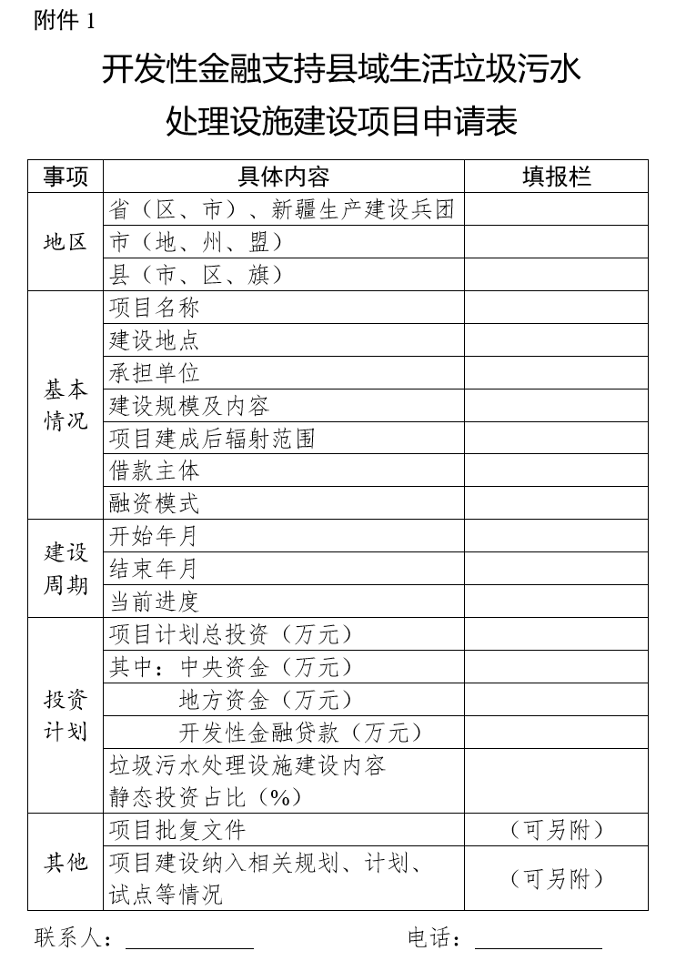 住房和城鄉(xiāng)建設(shè)部村鎮(zhèn)建設(shè)司胡建坤 010—58934706,58933123(傳)黃 瓊 010—68306870,88308848(傳)1.開發(fā)性金融支持縣域生活垃圾污水處理設(shè)施建設(shè)項(xiàng)目申請(qǐng)表2.開發(fā)性金融支持縣域生活垃圾污水處理設(shè)施建設(shè)項(xiàng)目進(jìn)展表