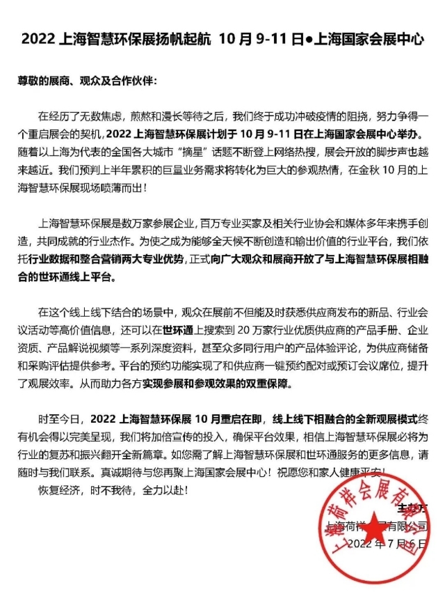 時(shí)至今日,2022上海智慧環(huán)保展10月重啟在即,線上線下相融合的全新觀展模式終有機(jī)會(huì)得以呈現(xiàn),我們將加倍宣傳的投入,確保平臺(tái)效果,相信上海智慧環(huán)保展必將為行業(yè)的復(fù)蘇和振興翻開(kāi)全新篇章。如您需了解上海智慧環(huán)保展和世環(huán)通服務(wù)的更多信息,請(qǐng)隨時(shí)與我們聯(lián)系。真誠(chéng)期待與您再聚上海國(guó)家會(huì)展中心!祝愿您和家人健康平安!