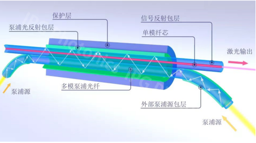 包層側(cè)泵浦技術(shù),由多模泵浦光纖和單模摻雜芯光纖組成雙光纖結(jié)構(gòu),將多模二極管光轉(zhuǎn)換成單模光纖激光器,具有極高的效率和高亮度。相比其他光纖激光器普遍使用端面泵浦而言,具有更高的效率和光束質(zhì)量(因為端面泵通常需要使用反射鏡,并且可能需要在激光器內(nèi)保持正氣壓,以避免灰塵和其他污染物)。