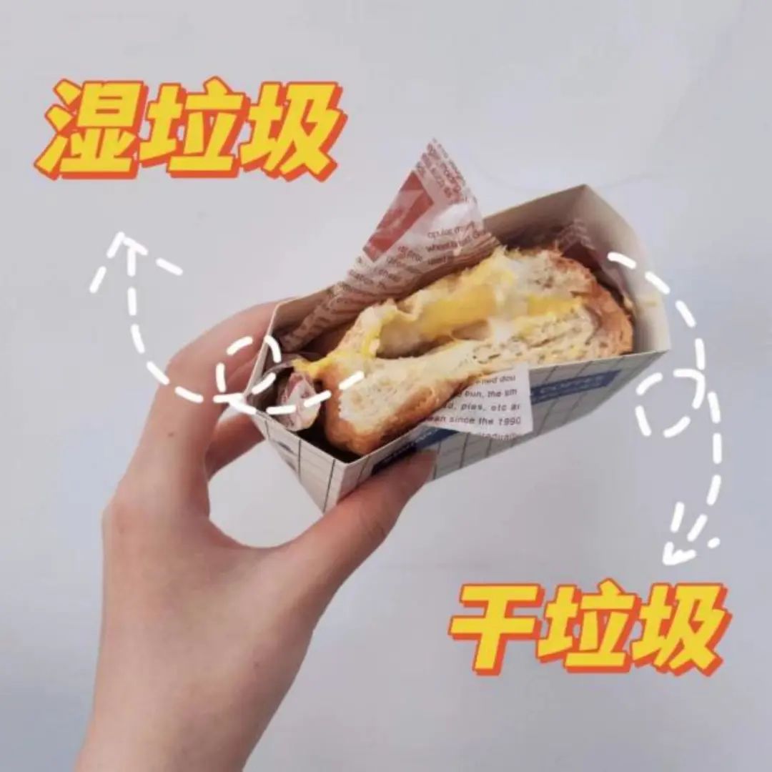 沒(méi)吃完的:吃剩的三明治——倒進(jìn)濕垃圾桶;包裝紙——扔進(jìn)干垃圾桶