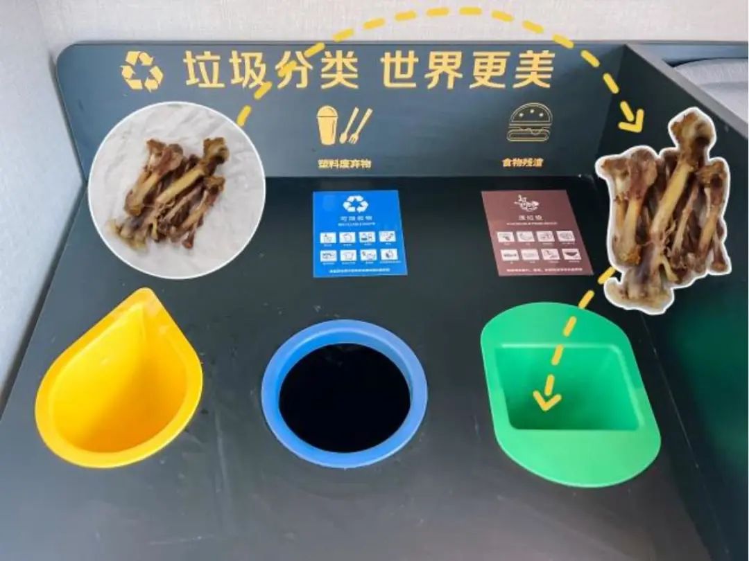 吃完了的:雞骨頭——扔進(jìn)濕垃圾;包裝紙——扔進(jìn)干垃圾桶