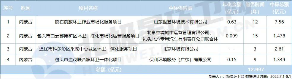 而內(nèi)蒙古市場(chǎng)令人稍感驚喜,7月爆出多個(gè)億級(jí)環(huán)衛(wèi)項(xiàng)目,成交總額約13億元。