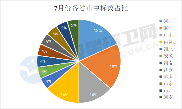 眾所周知,河北、浙江、廣東地區(qū)環(huán)衛(wèi)市場(chǎng)一直相當(dāng)火熱,7月也不例外,河北、浙江省均成交4個(gè)項(xiàng)目,成交額分別是24.06億元、20.43億元,榮獲冠、亞軍。