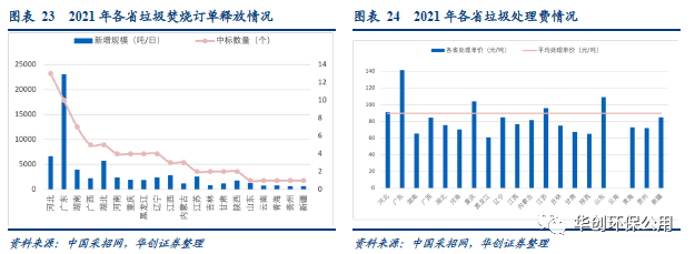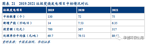 垃圾焚燒新訂單釋放速度減緩、處理費價格提升。2021年垃圾焚燒新增體量進一步下降,全年中標項目總處理規(guī)模達6.35萬噸/日,同比2020年下降15.67%。與此同時,2021年平均中標處理單價為89.63元/噸,同比2020 年增長12.73%。近三年以來中標價一直維持快速上升態(tài)勢,疊加政策推動,我們認為未來很可能按照“產(chǎn)生者付費”原則,實施居民處理費,健全收費機制,垃圾處理費單價有望進一步提升,降低對補貼依賴程度。